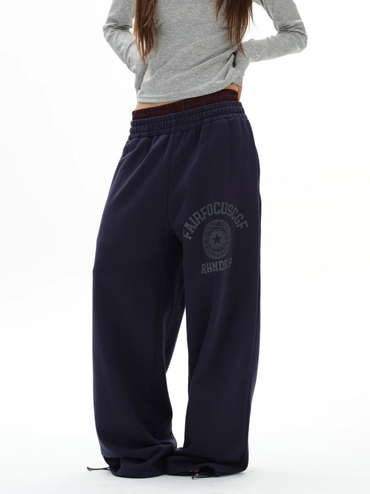 Navy Double Waistband Wide Leg Joggers with Graphic Detail