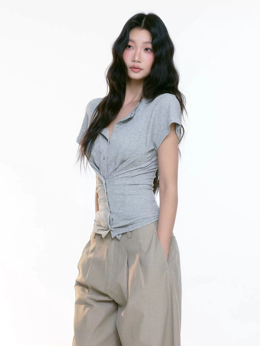 Grey Knit Cinched Polo Top